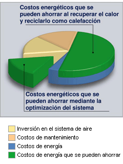 El calor emanado durante la producción de aire comprimido representa una gran posibilidad de ahorro, ya que el 100 por ciento de la energía que toma el compresor se convierte en calor. Esta es energía que se puede volver a utilizar o, dicho en otras palabras, reciclar. De hecho, el 96 % de la energía empleada para producir aire comprimido está disponible para reusarse. Esto no sólo conduce a ahorrar una gran cantidad de dinero a lo largo del año, sino que también ayuda a reducir considerablemente las emisiones de gas carbónico (CO2) a la atmósfera. La magnitud del ahorro depende del tamaño de los compresores y de la fuente de energía primaria que se emplee para operarlos (electricidad, gas, combustible). Además, un gran número de compresores viejos se pueden incluso reacondicionar para aprovechar el calor emanado de ellos durante su funcionamiento.